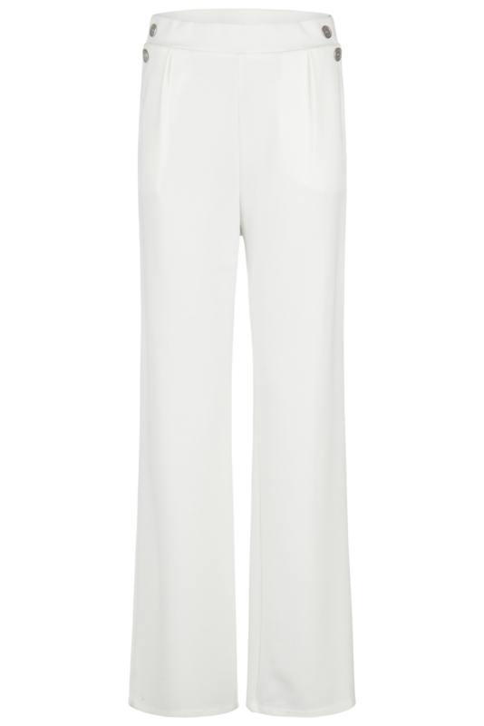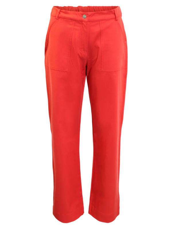 Pantalon met doorgestikte elastieken band en plat stukje voorzien van een siergesp. De pantalon heeft een smal been, rechte pijp en steekzakken. Dit model heeft en hoge taille. Door de zachte kwaliteit is dit een zeer comfortabele…